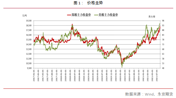8月份,中美棉價在市場一片猶疑與期待中,雙雙站上新高。美棉主力12月合約最近于8月17日最高點至96.71美分/磅,這是7年來新高。同時和今年2月底高點95.6美分/磅及2018年6月初高點94.82美分/磅接近,基本是除2010/11暴漲行情外的高位區(qū)。鄭棉近期高點則是8月18日所至的18505元/噸。較此前2月底高點17080元/噸高出8.34%,而較2018年高點19250/噸低3.87%。
